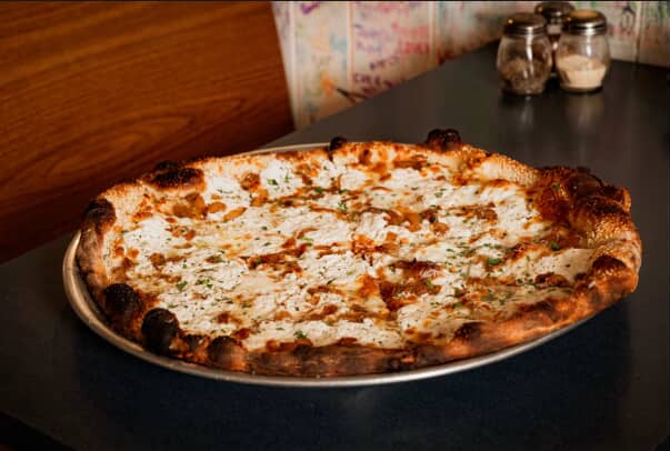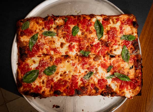 Thin-crust rounds and Brooklyn-style square pizzas at Johnny’s Pizza. Top sellers are the plain (bottom), the white pizza with lemon ricotta, caramelized onions and sesame seed crust (at top), and the pepperoni with hot honey. Orders are evenly split between rounds and square pan pizzas.
