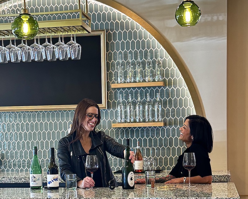 Champions of natural wine and women in winemaking, Nature’s Vin Director of Operations/Sommelier Elyse Lovenworth shares a glass with owner Ragini Parmar behind the lively bar.
