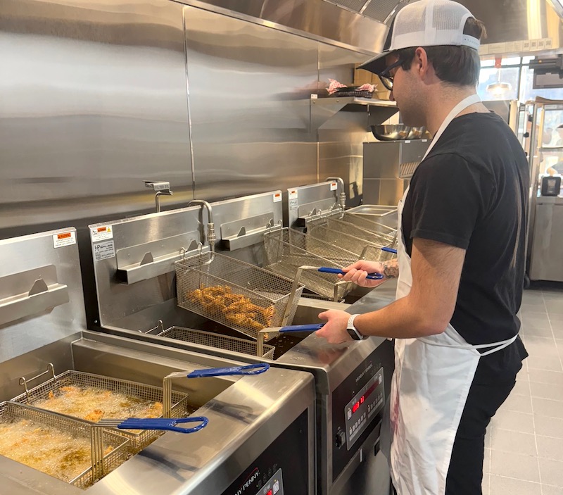 Kitchen Manager Logan O’Dell works the fryer in Bryn Mawr on opening day.