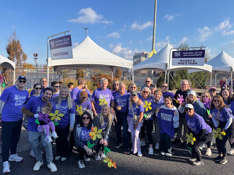 Not that their friend group hasn’t been extraordinarily supportive and generous, she says. Of the 618 teams entered in last fall’s Walk to End Alzheimer’s, the RuddStrong team of 54 walkers (below) raised the Walk’s third highest total: $44,250. (The two higher-ranking teams were corporate.) “For our family, that Walk is like Christmas morning. I don’t feel alone that day.”