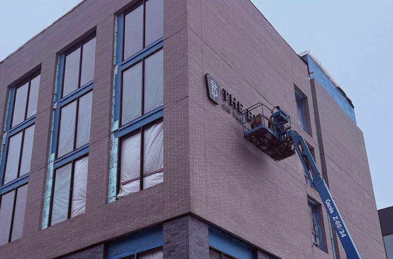 Construction crews affix The Brandywine to the building’s façade this week. The new hotel sits perpendicular to King of Prussia Road. The Radnor stop on the SEPTA’s Norristown High Speed Line is next door.