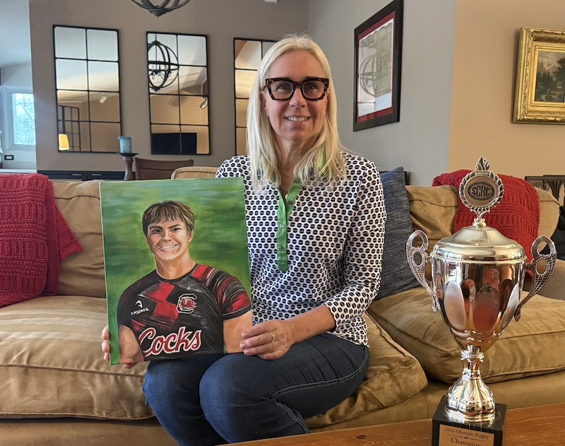 Leslie Harvey Elken at her Berwyn home with treasured memories: a portrait of Erik painted by a classmate and the championship trophy her son’s USC rugby team won after he scored the game-winner. Nicknamed the Gentle Giant from early childhood, Erik passed last November after a 10-month battle with a rare sarcoma. He was 22.