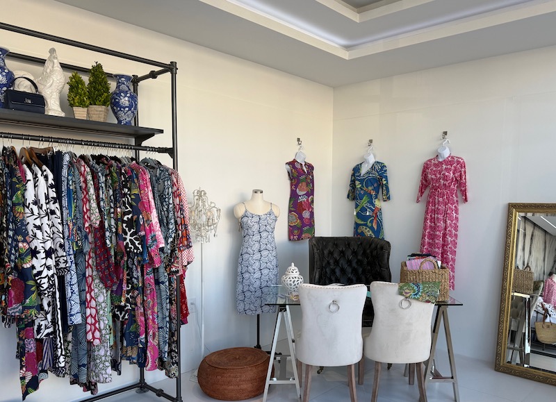 Some clothes are made-to-measure Karen Leslie’s designs. Others are ready-to-wear in a range of styles: boho, preppy, modern and trendy.
