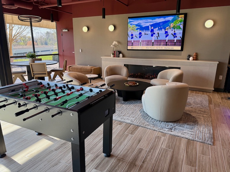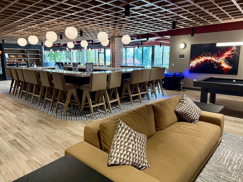 There’s also a fast-casual café, a pro kitchen, assorted seating indoors and out, and a comfy lounge area with a cozy fireplace, billiards and games.