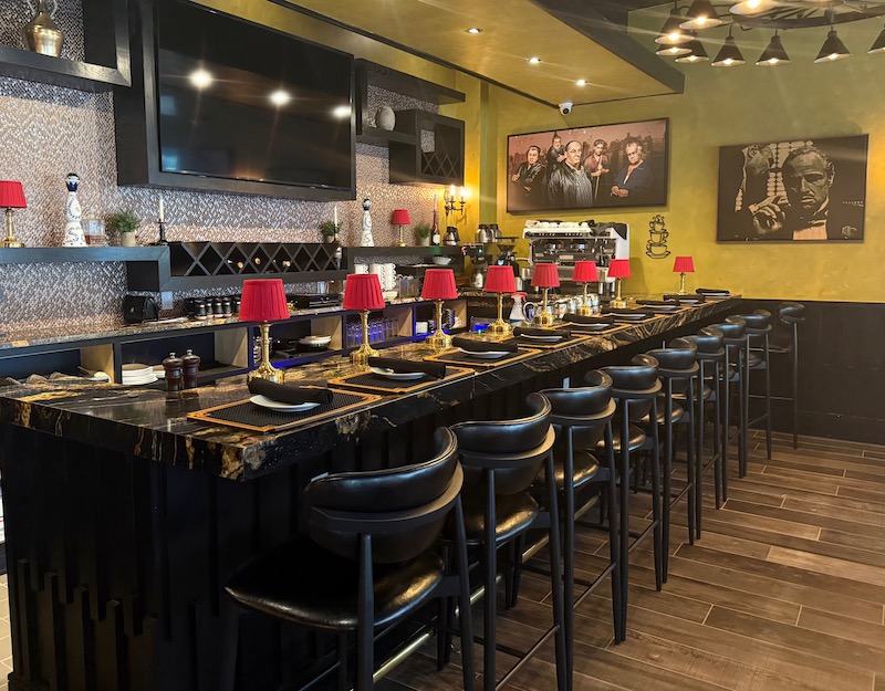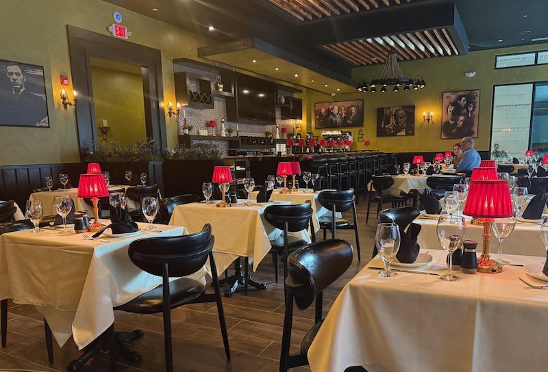 It’s Goodfellas meets date night: white tablecloths, black leather, red-and-gold lamps and a rogues gallery from The Godfather and The Sopranos guarding the room like capos.