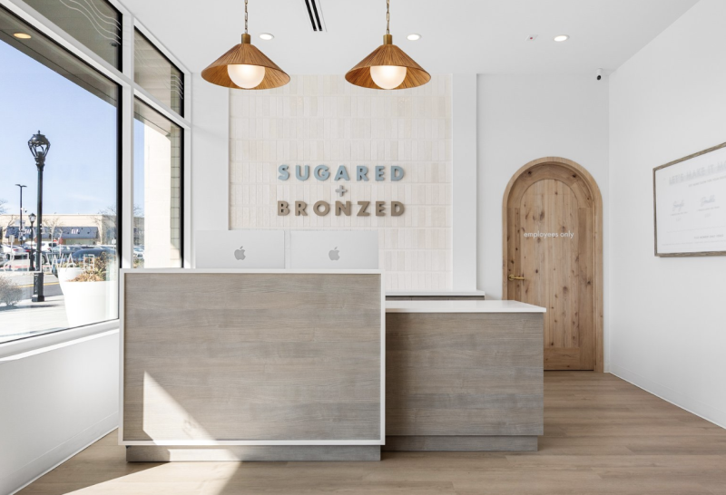 The sleek reception area at Suburban Square’s new Sugared + Bronzed studio.[/caption]